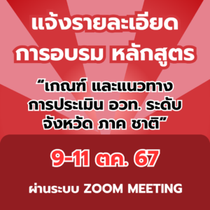 แจ้งรายละเอียดการอบรมหลักสูตร “เกณฑ์ และแนวทางการประเมินอวท. ระดับจังหวัด ภาค ชาติ” 9-11 ตค. 67