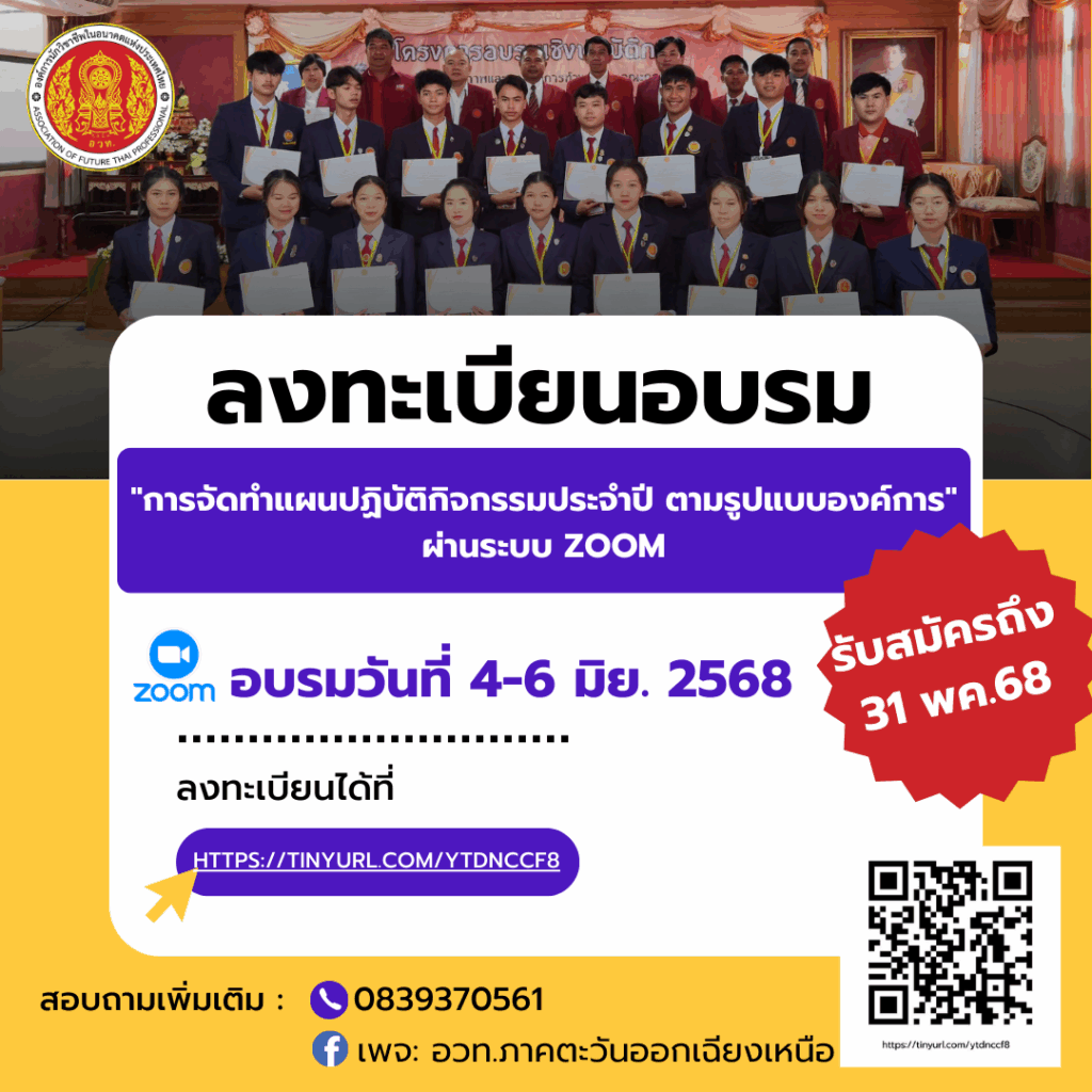 องค์การนักวิชาชีพในอนาคตแห่งประเทศไทย ภาคตะวันออกเฉียงเหนือ ได้กำหนดจัดการอบรมครูที่ปรึกษาองค์การนักวิชาชีพในอนาคตแห่งประเทศไทย ครูที่ปรึกษาชมรมวิชาชีพ และคณะกรรมการดำเนินงานองค์การ และคณะกรรมการดำเนินงานชมรมวิชาชีพ ของสถานศึกษาที่มีการจัดตั้งองค์การนักวิชาชีพในอนาคตแห่งประเทศไทย สังกัดภาคตะวันออกเฉียงเหนือ ให้มีความรู้ ความเข้าใจในการจัดทำแผนปฏิบัติกิจกรรมประจำปี และเกณฑ์ ตัวชี้วัด การประเมินองค์การ (ฉบับปรับปรุง) ประจำปีการศึกษา ๒๕๖๘ ระหว่างวันที่ ๔ – ๖ มิถุนายน ๒๕๖8 โดยรูปแบบออนไลน์ จำนวน ๒๐ ชั่วโมง สำหรับผู้เข้ารับการอบรมที่มีผลสัมฤทธิ์จากการทดสอบไม่น้อยกว่าร้อยละ ๗๐ จะได้รับเกียรติบัตรผ่านการอบรม